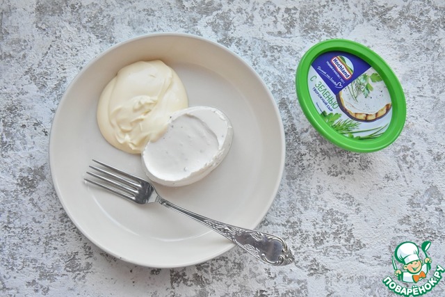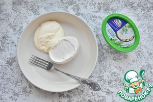 В миску перекладываю 140 граммов творожного сыра Hochland, добавляю майонез и хорошо растираю вилкой до полной однородности.