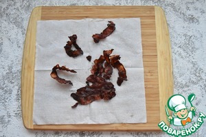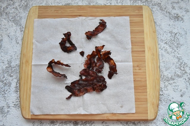 Бекон поджариваю на сковороде и выкладываю на бумажную салфетку для удаления лишнего жира.
