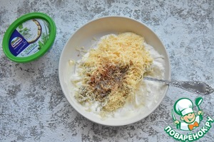 К творожному сыру добавляю раскрошенный сыр с голубой плесенью и натертый на мелкой терке твердый сыр Hochland Грюнландер. Добавляю соль по вкусу, черный молотый перец, чесночный порошок и хлопья острого перца.
