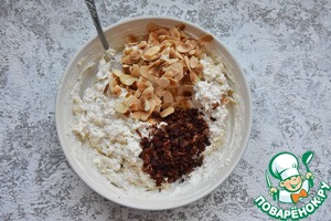 В сырную закуску добавляю поджаренный миндаль и раскрошенный на мелкие кусочки хрустящий бекон. Перемешиваю чтобы все составляющие равномерно распределились. По желанию можно добавить в закуску зеленый лук.