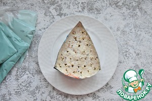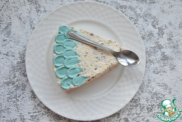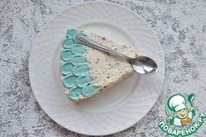 Удаляю форму из фольги. Для украшения блюда в стиле елочки, наношу по нижнему краю несколько капель из подкрашенного творожного крема. Каждую каплю " растушовываю" по направлению вверх с помощью чайной ложки. Таким образом наношу крем на всю поверхность, уменьшая количество капель каждого последующего слоя.