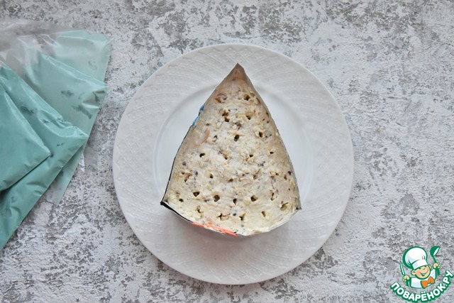 Из фольги формирую форму в виде треугольника. Устанавливаю ее на блюдо. Перекладываю сырную закуску в форму. слегка утрамбовывая. Отправляю закуску в холодильник для настаивания.