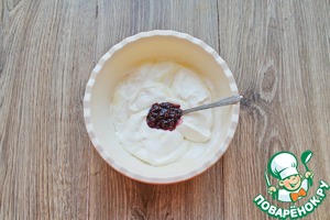 Добавьте во взбитые сливки варенье и ванильный сахар, перемешайте.