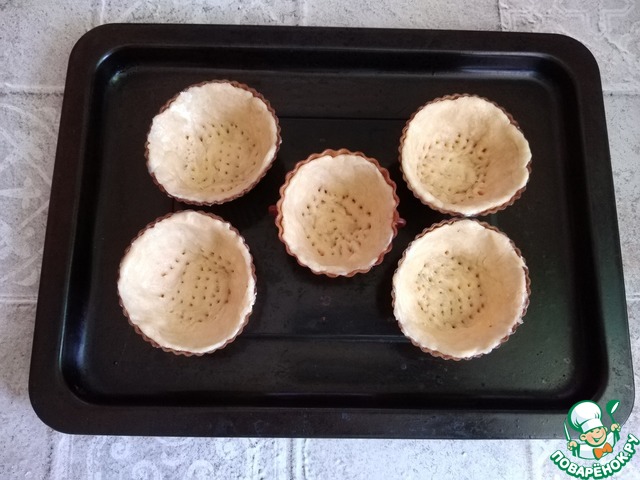 Берём силиконовые формочки для кексов. От теста отрываем кусочки, скатываем в шарики и потом растягиваем по размеру формочки, укладываем тесто в них. Вилкой накалываем дно и ставим в разогретую духовку минут на 10. Ориентируйтесь по своей духовке. У меня получилось 5 тарталеток размером со стандартную силиконовую формочку для кексов.