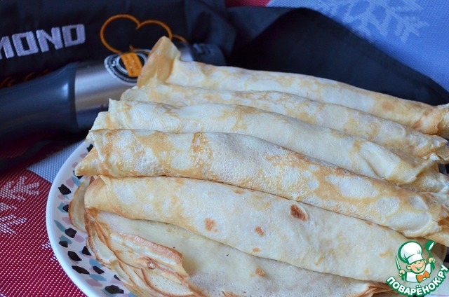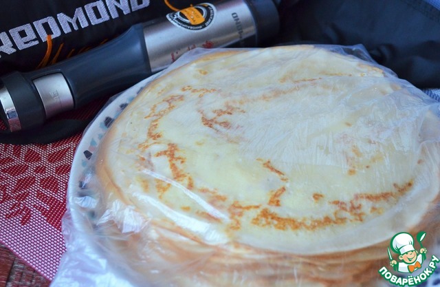 P.S.: Иногда хозяйки жалуются - невозможно свернуть блинчик с начинкой, рвётся, трескается. Для того чтобы этого избежать - горячие блинчики необходимо сразу смазывать сливочным маслом, по всей поверхности. Блинчики будут эластичными долгое время.