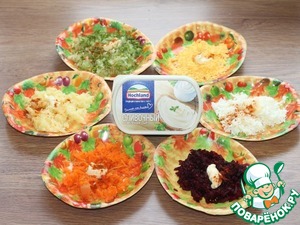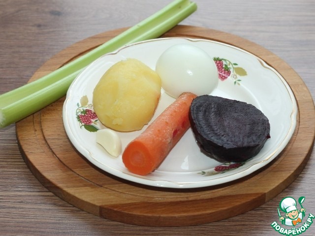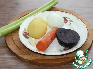 3. Берем все овощи и сельдерей по 60 грамм. Натираем на крупной терке в отдельные миски картофель, сельдерей, морковь и свеклу. Яичный белок и желток трем на мелкой терке.