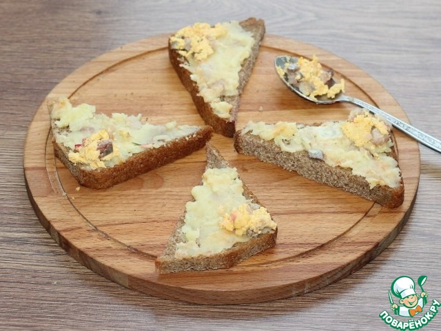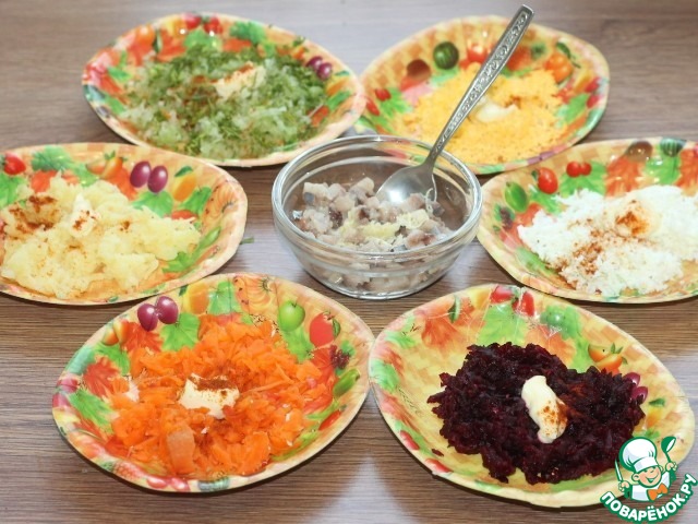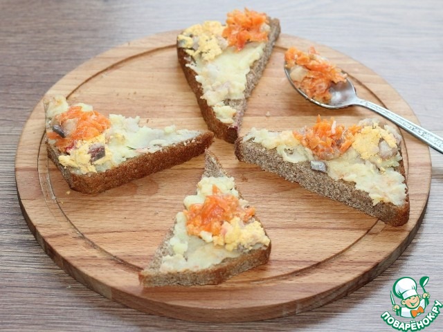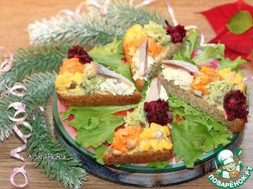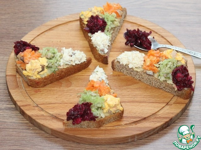 12... и свеклу. Получилось 8 пестрых бутербродов. Сверху кладем по небольшому кусочку селедочки (оставшееся 60 гр).