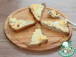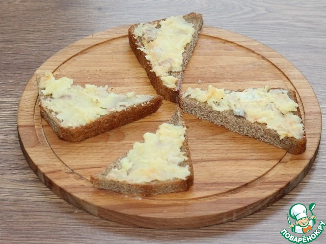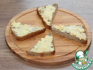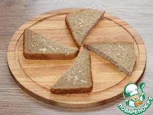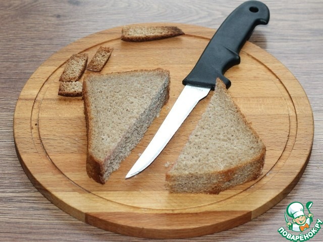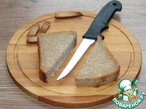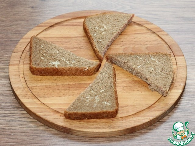 5. Берем 4 куска нарезного хлеба, отрезаем только черную корочку и разрезаем каждый кусочек пополам.