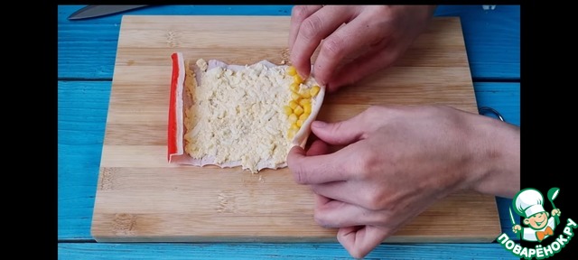 Крабовые палочки раскручиваем и делаем как показано на видео. Фиксируем с красной стороны ножом и выкладываем начинку примерно 1 ч. л, затем кладём кукурузу и заворачиваем в трубочку.