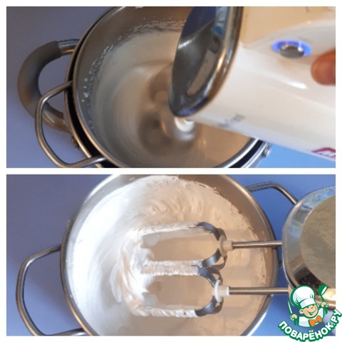 Взбить белки с сахаром на водяной бане. Как только сахар растворится, убрать с водяной бани, добавить лимонный сок и продолжать взбивать до устойчивой пиков.
