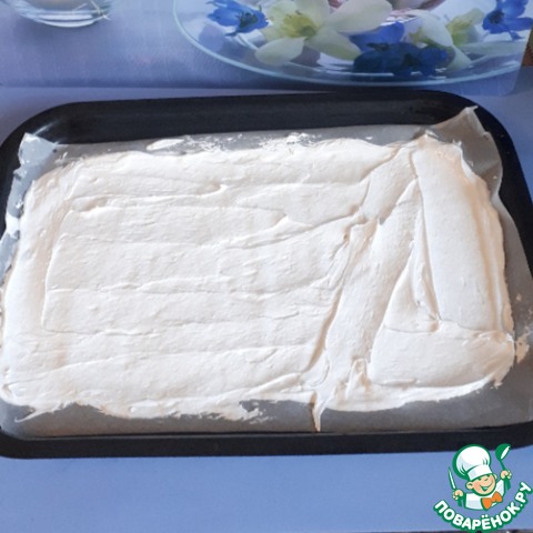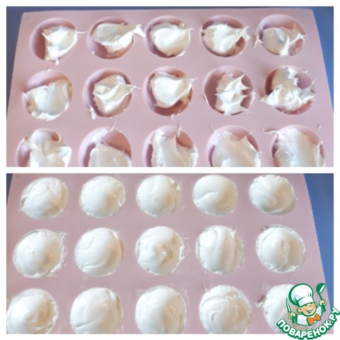 Разложить часть меренги по ячейкам силиконовой формочки. Затем чайной ложкой аккуратно распределить массу по ячейкам, сделать углубления. Диаметр ячейки 4 см.