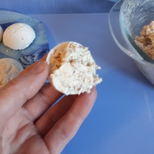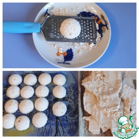 Нагреть духовку до 70 градусов и поставить изделия из меренги подсушиваться на 1,5-2 часа в зависимости от вашей духовки. После того как половинки подсохнут, аккуратно вытащить их из формочек. Края половинок безе подравнять с помощью терки.
