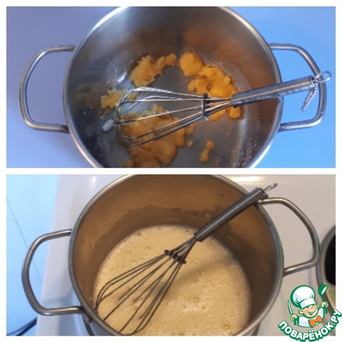 Приготовим крем. Сахар с желтком немного взбить, добавить горячее молоко, все хорошо перемешать и поставить на плиту, довести до кипения. Затем массу снять с огня и остудить.