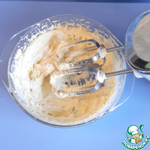 Взбить сливочное масло комнатной температуры, понемногу добавлять приготовленную ранее молочно-яичную массу, продолжать взбивать крем. Часть крема сразу отложить в отдельную емкость, примерно одну столовую ложку с горкой.