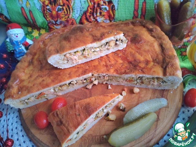Закрытый пирог на кефире. Готовить также можно с любой белой рыбой. В моё детство пекли такие пироги с треской, хеком и т. д. Размер пирога 28 см на 17 см, высота-3 см.