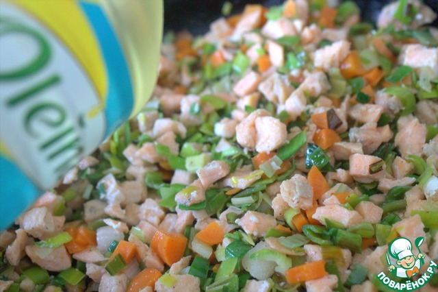 Лосось ( у меня замороженный) нарезать кубиком и немного обжарить с луком, морковкой, поперчить, посолить.
