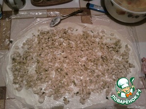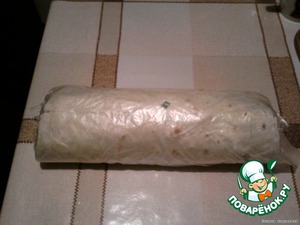 Аккуратненько свернуть рулет, завернуть в пленку и поставить в холодильник на несколько часов (я обычно ставлю на ночь).