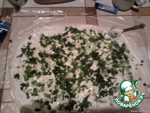 Накрыть вторым листом лаваша. Смазать лист майонезом и выложить мелко рубленные яйца, зеленый лук и оставшуюся зелень петрушки