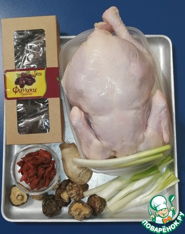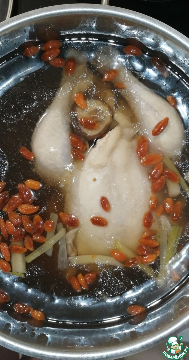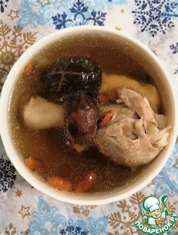 Суп готов. В суповую тарелку положить сначала мясо, потом суп, добавив гриб, финик и ягоды годжи + 1 ст. л. легкого соевого соуса.