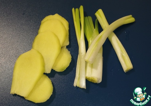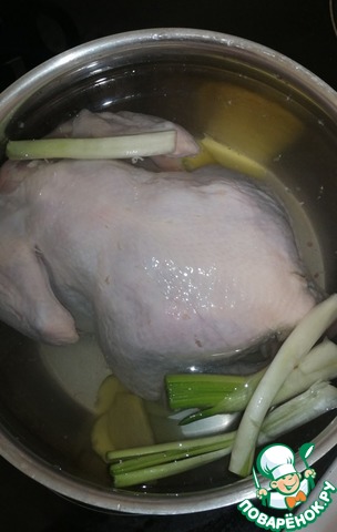 Курицу залить холодной водой, положить имбирь и придавленный лук. Не солить.