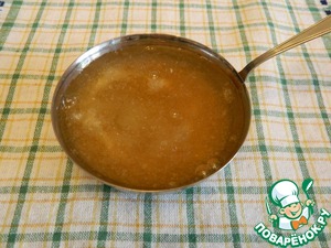 В горячую массу выложим желатин. Размешаем до тех пор пока он растворится. 1/3 желе отольем в другую посуду.