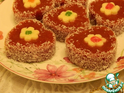 Можно разрезать на квадратики, обсыпать кокосовой стружкой и пить чай с конфетками. Но мне захотелось сделать десерт с ягодным желе, где украшением служат эти конфетки.