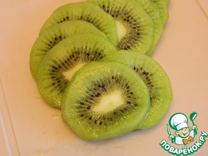 Киви очистим от шкурки и нарежем на тонкие кружочки, чем тоньше они будут, тем удобнее их укладывать на верхний слой.