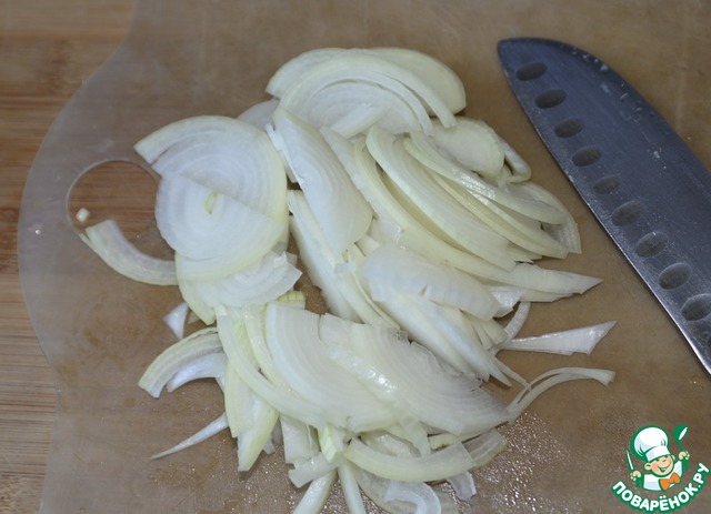 Лук режем полукольцами или тонкими полосками.