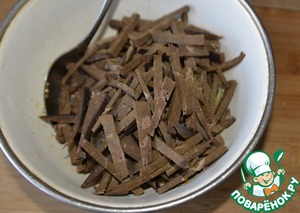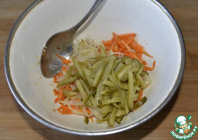 Для приготовления салата нам понадобится морковь по-корейски, я её готовлю заранее, тоже используя масло подсолнечное "Олейна".