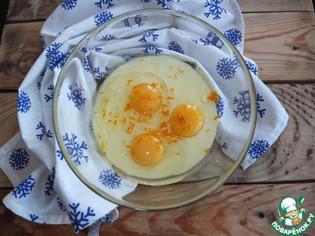 К сгущенному молоку добавляем яйца, ванильный сахар и цедру половины апельсина. Взбиваем до однородной консистенции.