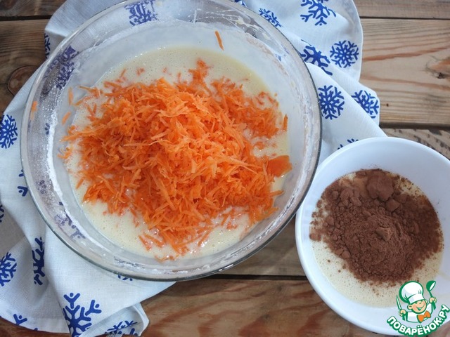 Две столовые ложки теста откладываем в меньшую емкость, добавляем какао-порошок.