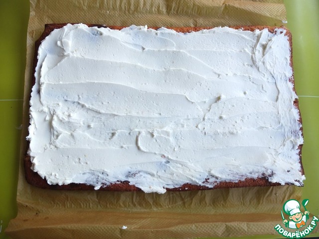 Аккуратно сворачиваем в тугой рулет. Не бойтесь повредить бисквит, он отлично держит форму. Я завернула рулет в пергамент, и сверху в пищевую пленку.