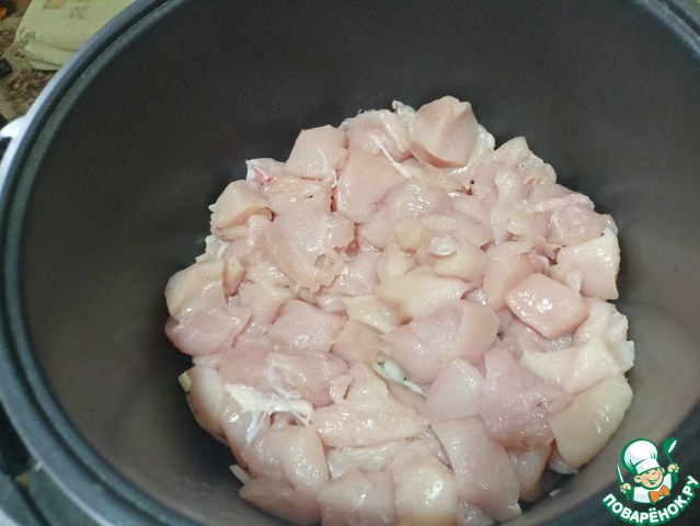 Отправляем в чашу масло и куринное филе — Режим «Жарка» 15 минут (Не забываем перемешивать каждые 3-4 минуты).
