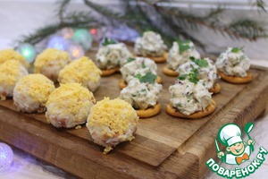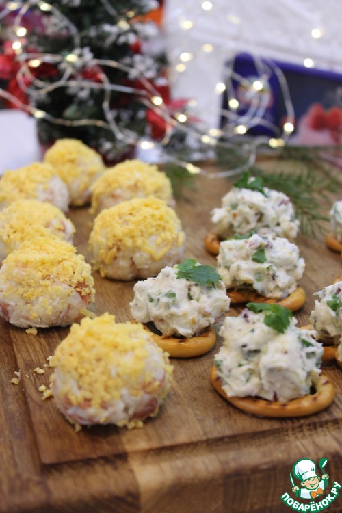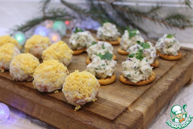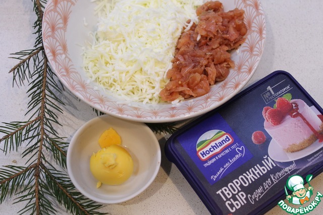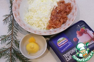 Для первой закуски к тёртому сыру нужно добавить творожный и мелко нарезанную красную рыбку. Яйцо разделить на белок и желток. Желток пока отложить, а белок также натереть на мелкой тёрке. Всё хорошо перемешать. Совет: для пикантности можно в массу добавить измельчённый чеснок.