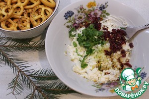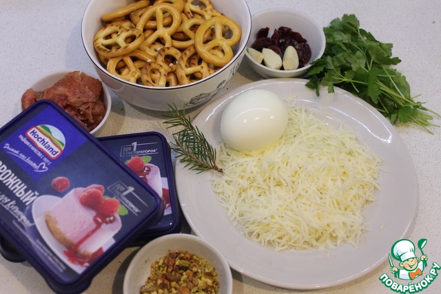 Для второй закуски к творожному сыру добавить измельчённые фисташки, нарезанные клюкву и петрушку, чеснок пропустить через чеснокодавилку. Хорошо всё перемешать.