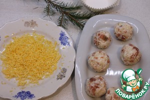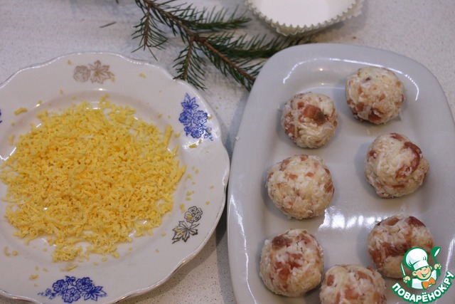 Из получившейся массы скатать небольшие шарики, желток натереть на мелкой тёрке. Обвалять в нём шарики ил просто посыпать.