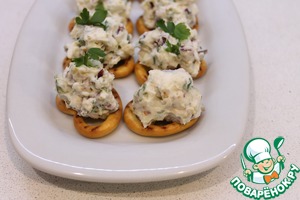 Выложить закуску на крекеры и подавать, украсив листиком петрушки.