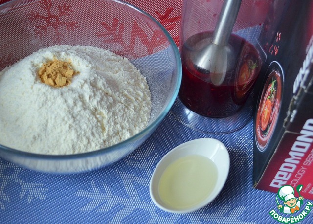 Муку просеять, добавить сок, растительное масло и соль, замесить эластичное тесто. P.S.:муки может понадобиться чуть больше/меньше. Тесто завернуть в пакет, оставить на cтоле, на 30 минут.