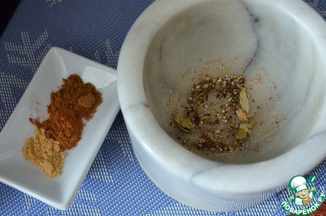 В ступке тщательно истолочь 3 гвоздики, кардамон, просеять. Приготовить корицу, имбирь и мускатный орех. Вначале я взяла по 1/2 ч. л. молотых специй.