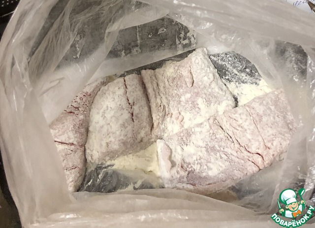 Для более равномерной панировки закладывайте в пакет по 2 кусочка, пакет завяжите и встряхните, чтобы мука равномерно покрыла каждый кусочек со всех сторон. Потом запанируйте еще партию из 2-х кусочков таким же образом и т. д.