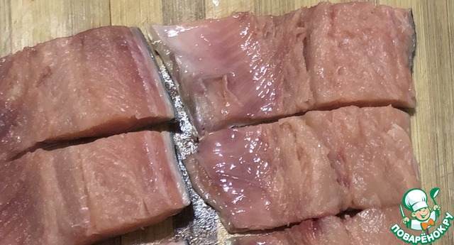Я режу сначала рыбу на стейки шириной около 5 см, а потом делю пополам вдоль хребта. Одна часть остается без хребта, а вторая с хребтом, его тоже срезаю. Удаляю оставшиеся брюшные и др. кости.