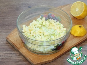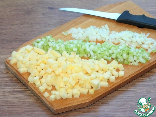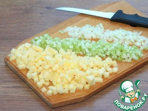 1. Овощи и фрукты помыть и очистить от шкурки, яблоко от семечек. Нарезать маленькими кубиками.