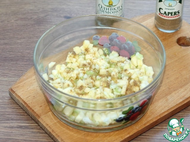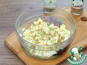3. Добавить оливки с лимоном и каперсы, перемешать.