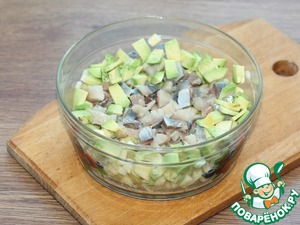 6. Выложить в салат авокадо и селедочку, поперчить.