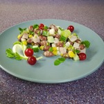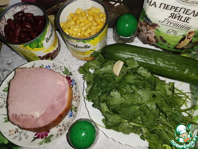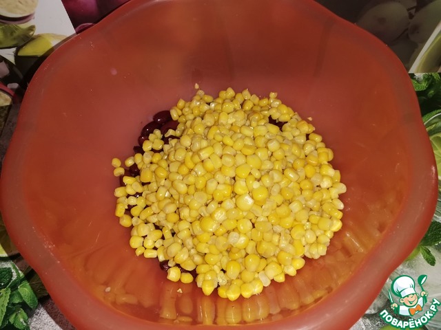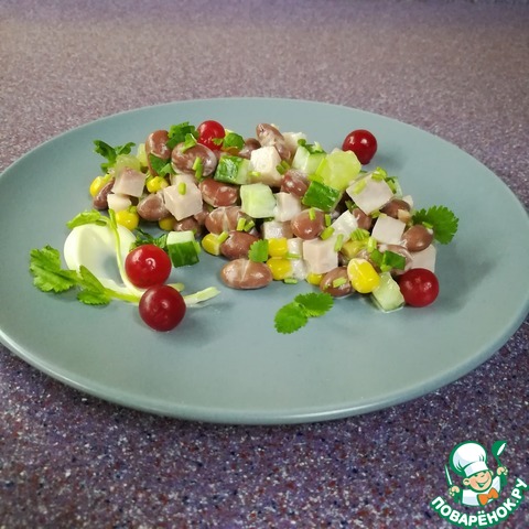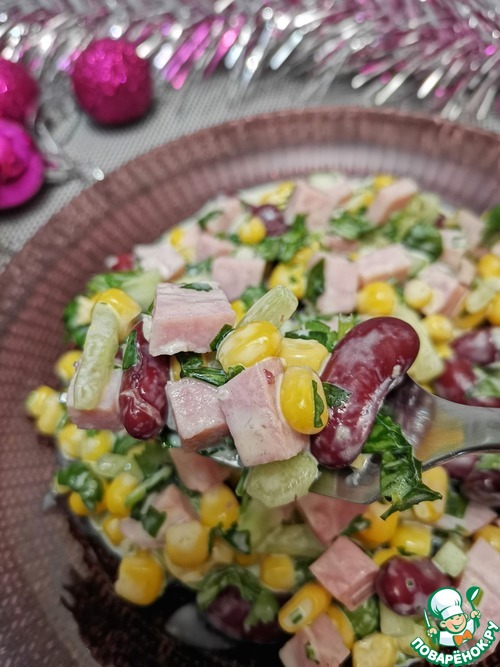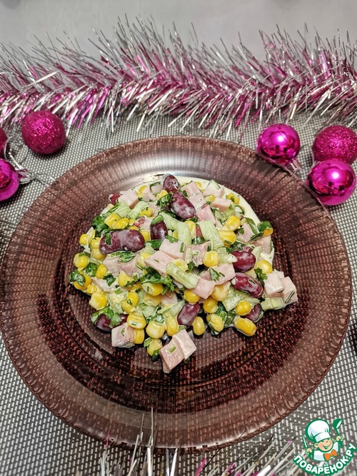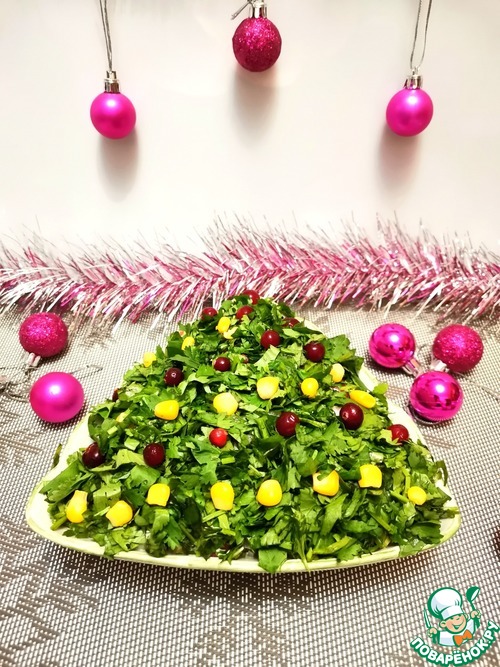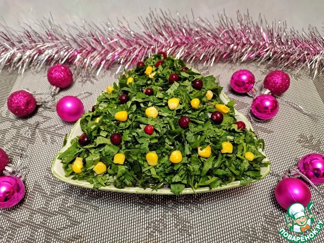 Выложить в салатник и украсить: посыпать кинзой, раскидать кукурузу и клюкву в виде гирлянд.