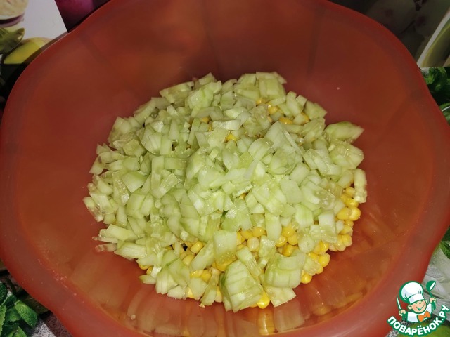 Вымыть и нарезать кубиками огурец. Кожицу я обычно срезаю.