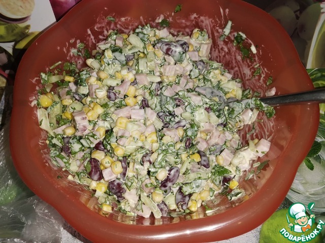 Салат посолить, поперчить по своему вкусу и заправить майонезом.