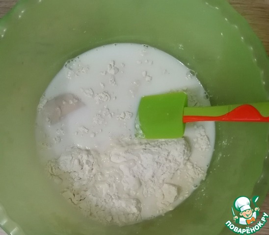 В тёплом молоке растворить дрожжи, сахар и часть муки. Размешать до консистенции сметаны. Накрыть, оставить в тёплом месте на 30 минут.