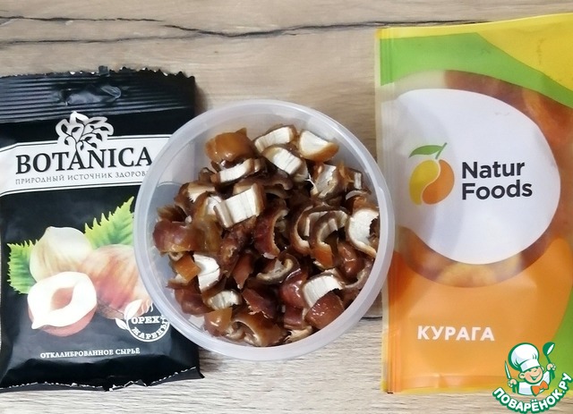 Курагу ошпарить кипятком, через пять минут воду слить, курагу обсушить и нарезать на кусочки (6-8). Кумкват разрезать чуть мельче. Я использовала курагу и кумкват от ТМ NaturFoods, они качественные и достаточно сладкие.