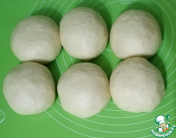 Каждый кусочек округлить в колобок, смазать верх раст. маслом, дать отдохнуть.